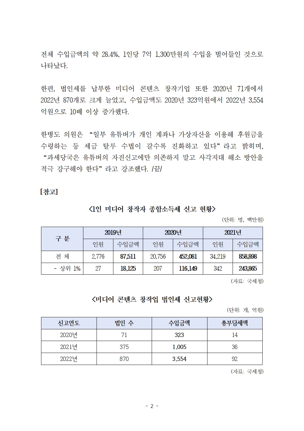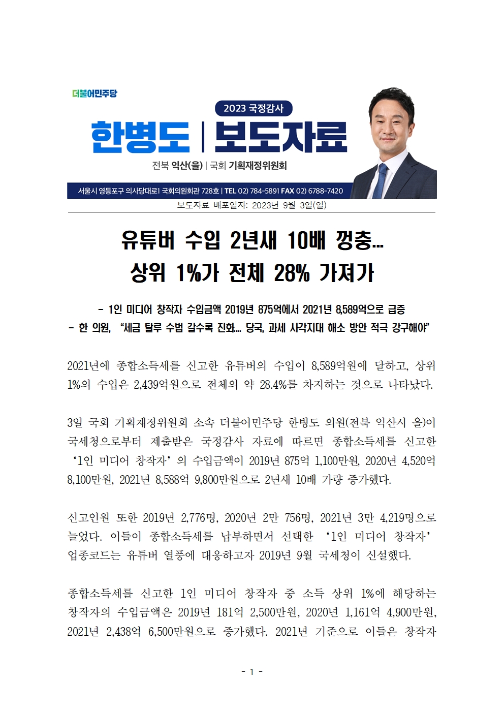 [한병도의원]2023기재위국정감사보도자료(2)_유튜버 수입 2년새 10배 껑충 상위 1퍼센트가 전체 28퍼센트 가져가.hwp