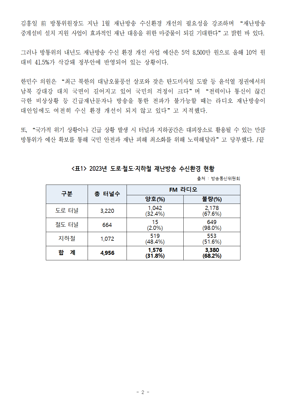 보도자료_한민수의원_철도_터널_98%가_라디오_먹통인데도_방통위_지원_사업_예산은_삭감 (2).hwp