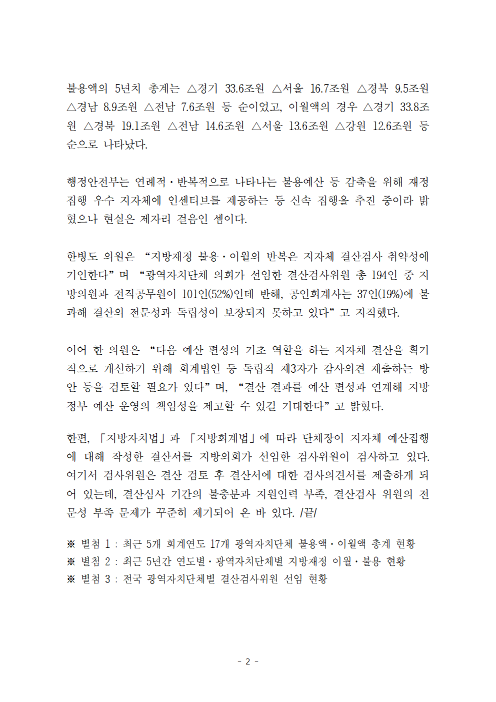 [한병도의원]2024행안위국정감사보도자료(2)_지난 5년 지방정부 편성하고 못 쓴 돈 294조원 달해.hwp