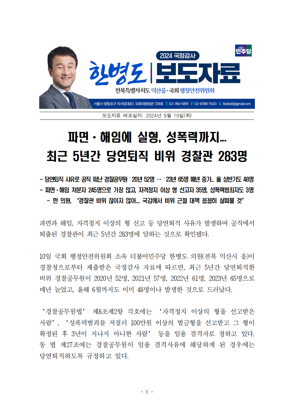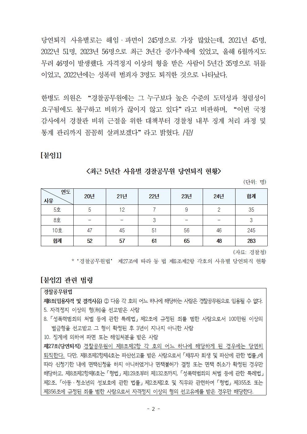 [한병도의원]2024행안위국정감사보도자료(8)파면ㆍ해임에 실형_ 성폭력까지... 최근 5년간 당연퇴직 비위 경찰관 283명.hwp