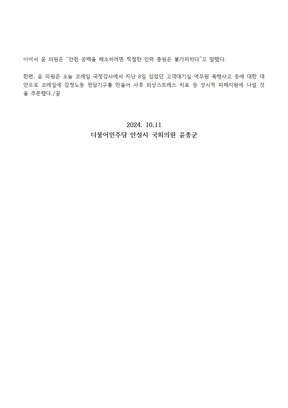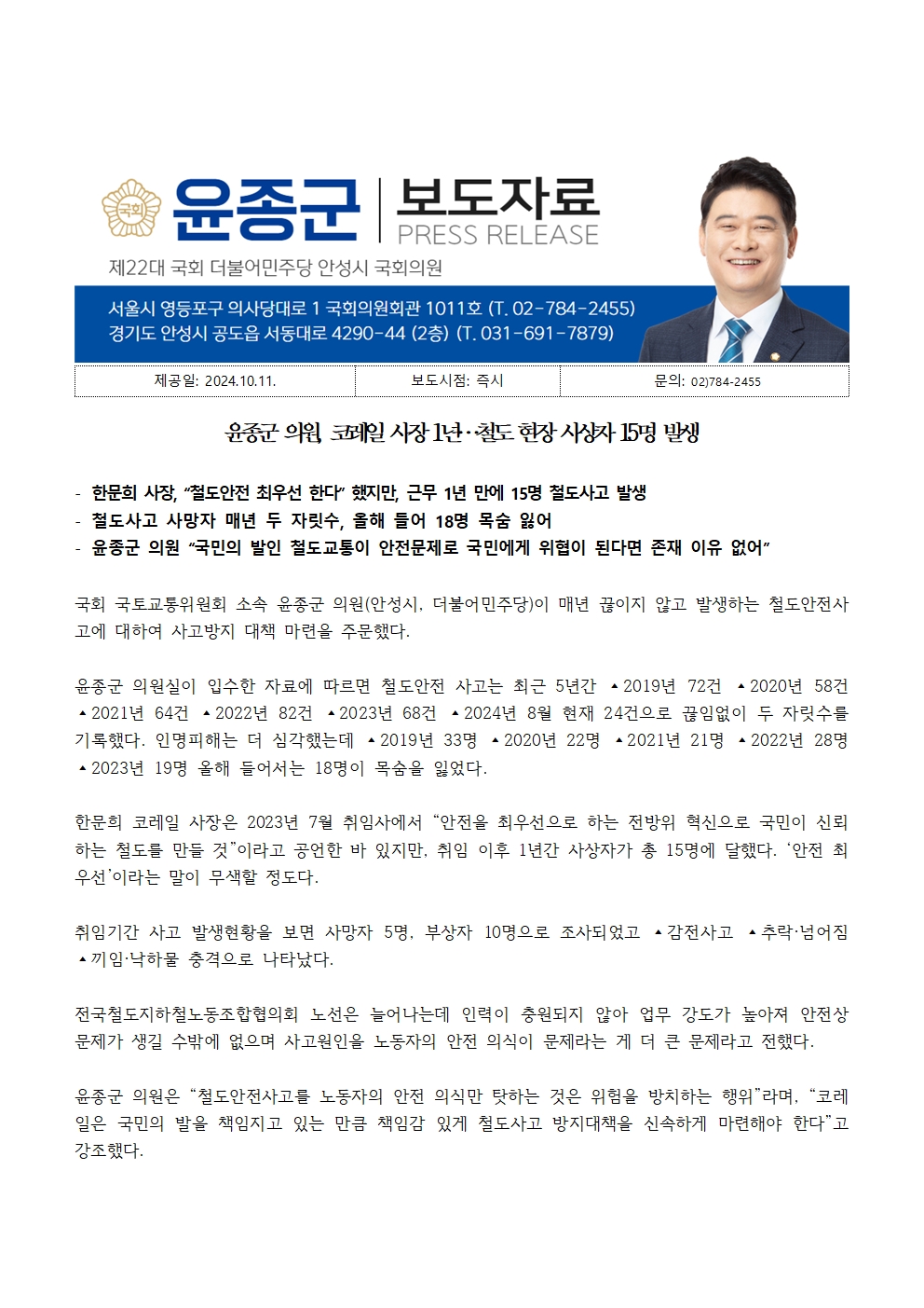 241011_윤종군의원_코레일사장 취임1년 철도사고 사상자15명 발생.hwp