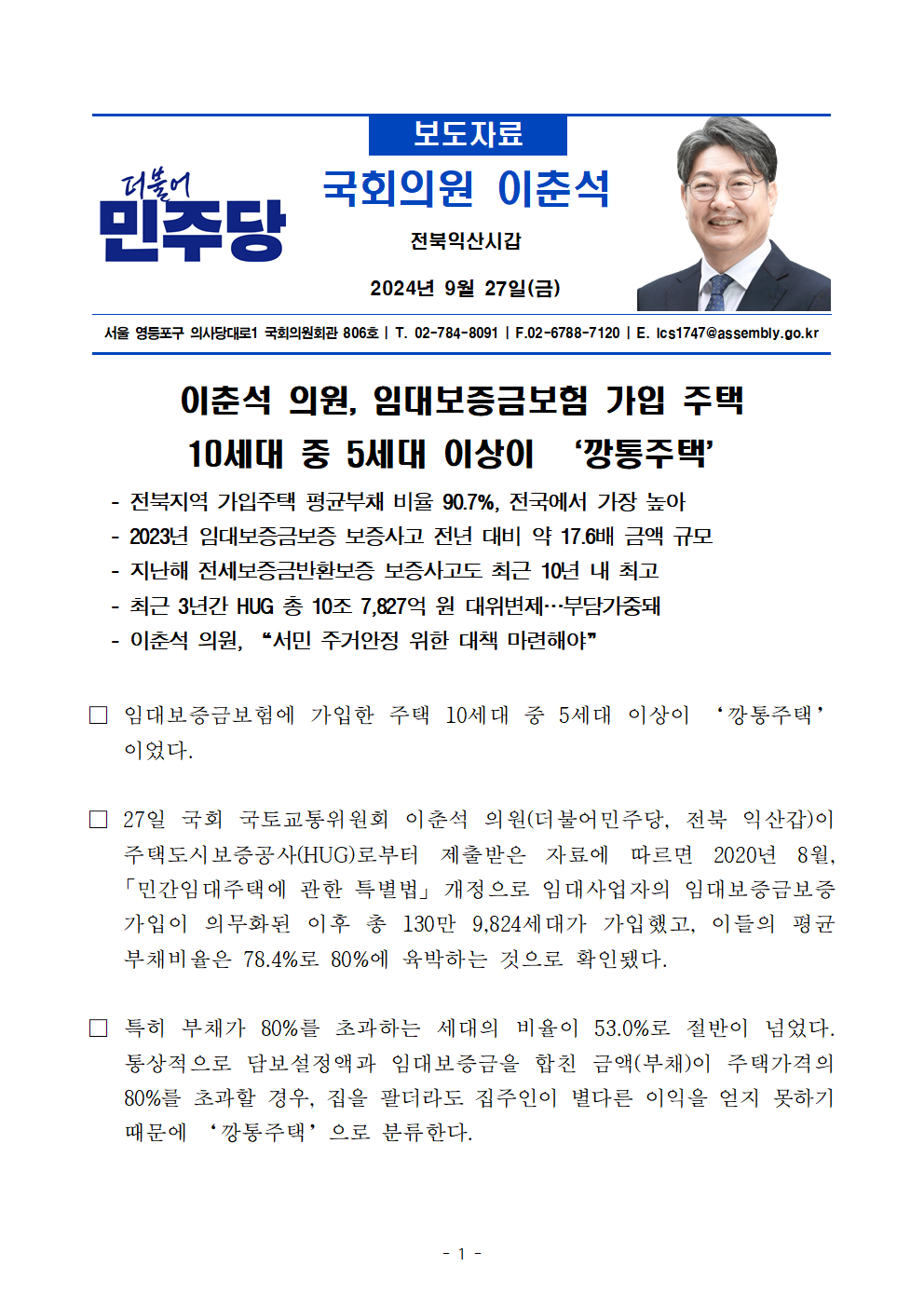 [국감_보도자료8]_240927_이춘석_의원__임대보증금보험_가입_주택_10세대_중_5세대_이상이_‘깡통주택_.hwp