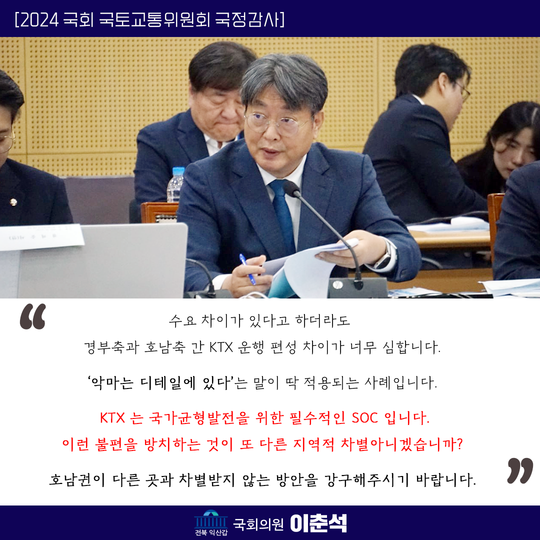 [이춘석 의원 국정감사 보도자료] 이춘석 의원, KTX 열차 운행도 경부·호남 ‘차별’