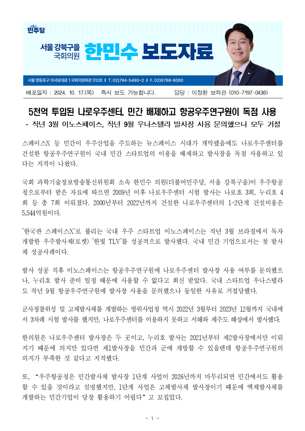 241017_한민수_5천억_투입된_나로우주센터__민간_배제하고_항공우주연구원이_독점_사용 (2).hwp