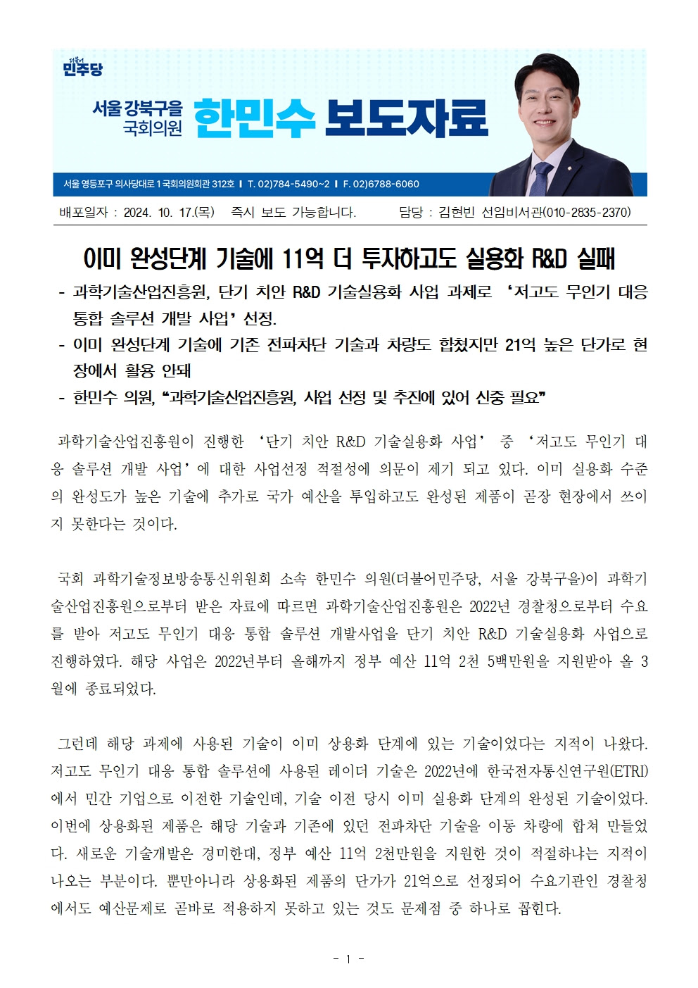 241017_보도자료_한민수의원_이미 완성단계 기술에 11억 더 투자하고도 실용화 R&D 실패.hwp