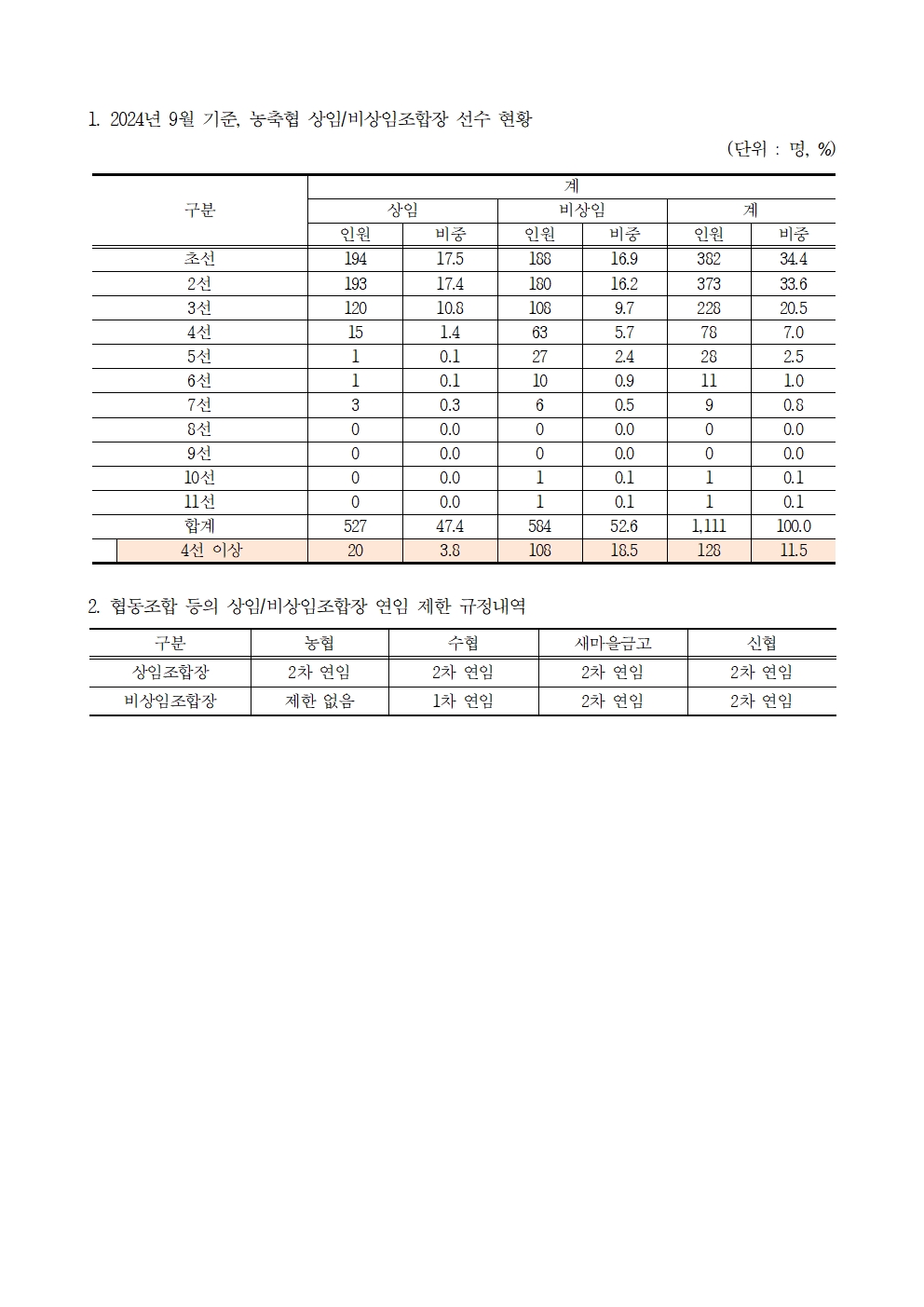 [윤준병 의원 국정감사 보도자료] 농협 비상임조합장 10명 중 2명은 4선 이상, 10·11선 비상임조합장도
