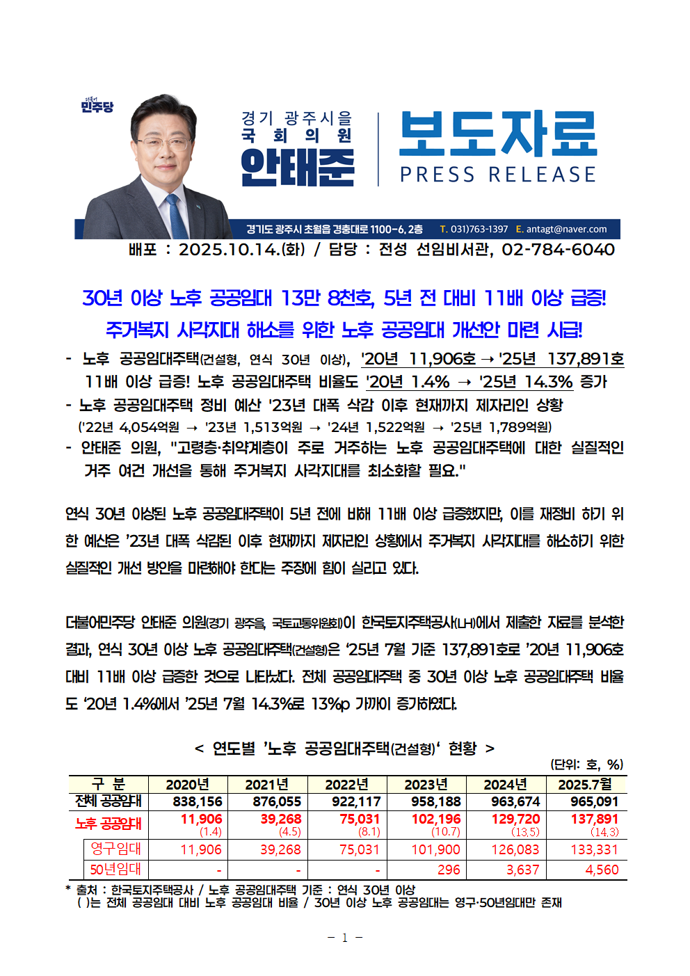 251014 (안태준 의원 보도자료) 1. 30년 이상 노후 공공임대 13만 8천호 5년 전에 비해 11배 이상 급증!.hwp