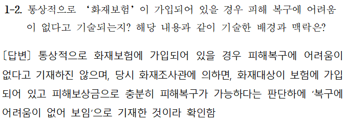 통상적으로 화재보험에 가입되어 있다는 이유로 ‘피해복구에 어려움이 없다’고 기재되진 않는다. 실제 의원실이 소방청에 문의한 결과, “피해보상금으로 충분한 피해복구가 가능하다는 판단하에 기재한 것”으로 확인했다.