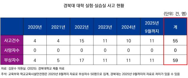특히 경북대로부터 별도 제출 받은 현황 자료에 따르면, 2020년부터 2025년 9월까지 경북대에서만 총 55건의 실험실 사고가 발생했으며, 부상자는 59명에 달했다. 전국 대학 중에서도 가장 많은 수치로, 연구·교육 현장의 안전 관리가 여전히 허술하다는 비판이 제기된다.