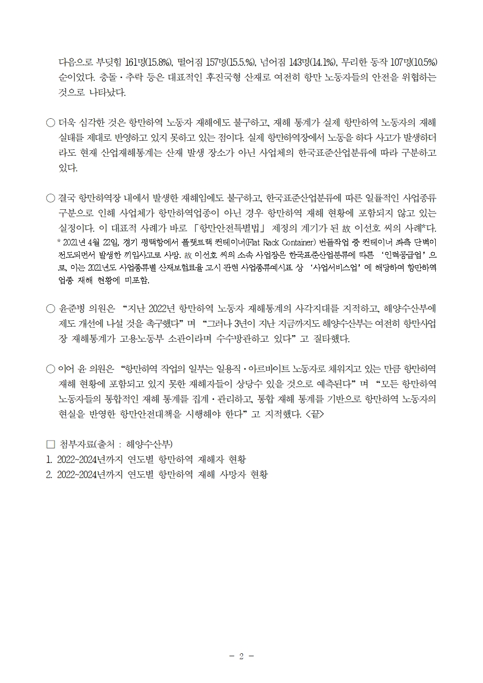 251015 [윤준병 의원 국정감사 보도자료] 항만하역장에서 노동하다 다쳐도 항만하역 재해통계에는 없는 노동자.hwp