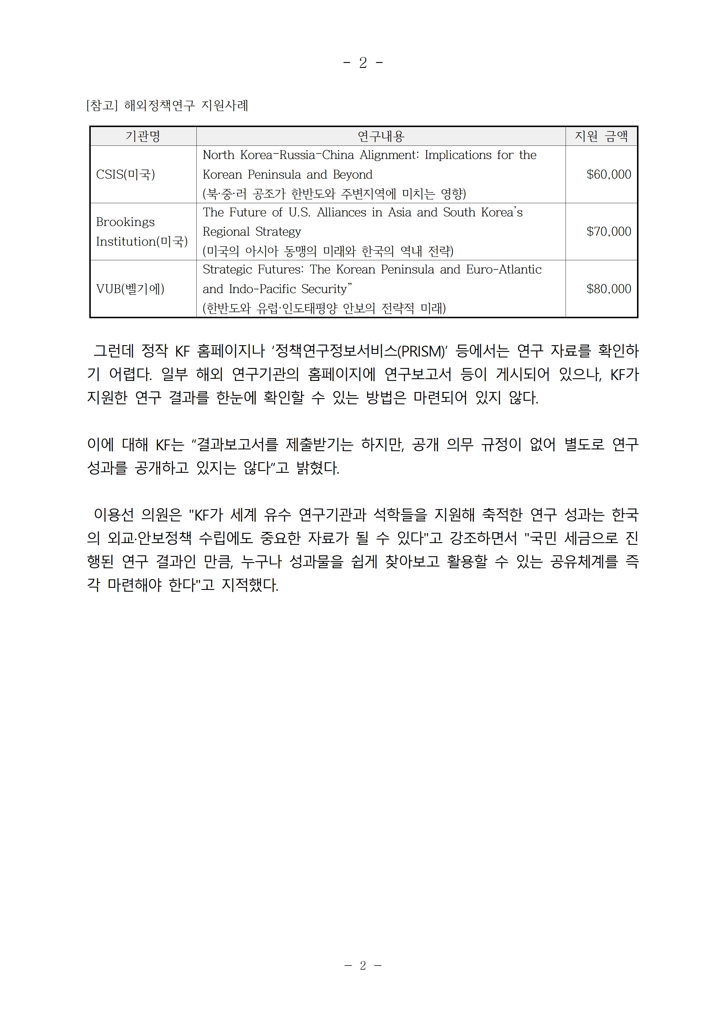 [이용선 국회의원 보도자료] KF, 230억 투입해 해외 정책연구 지원했는데… 성과는 어디에?