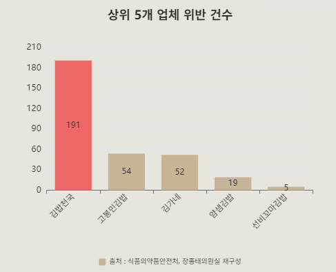 - 국내 대표 김밥 프랜차이즈 ‘김밥천국’, 5년간 식품위생법 191건 위반으로 최다