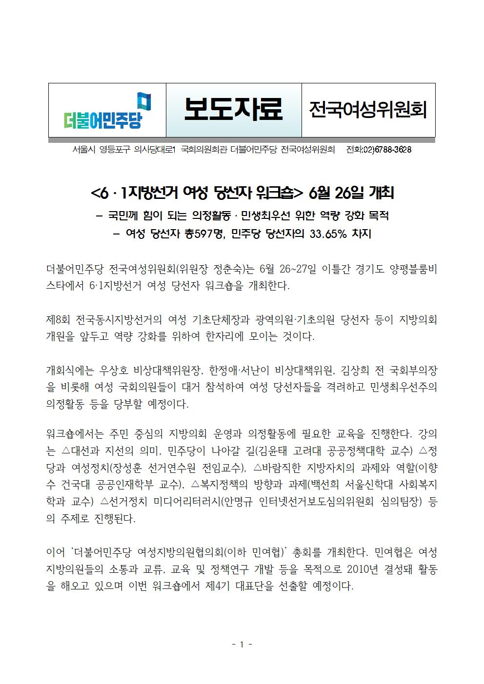 [보도자료] 더불어민주당 전국여성위원회, '6.1지방선거 여성 당선자 워크숍' 6월 26일 개최