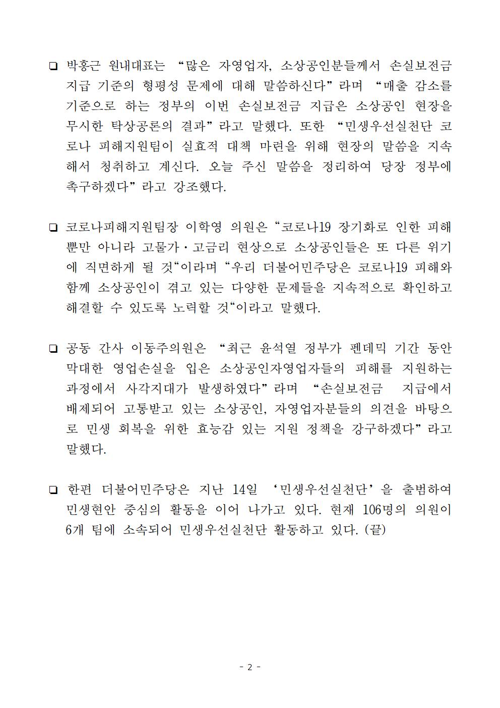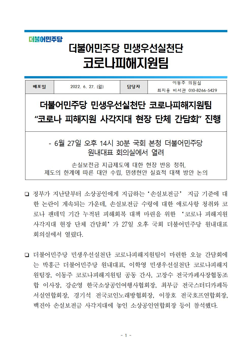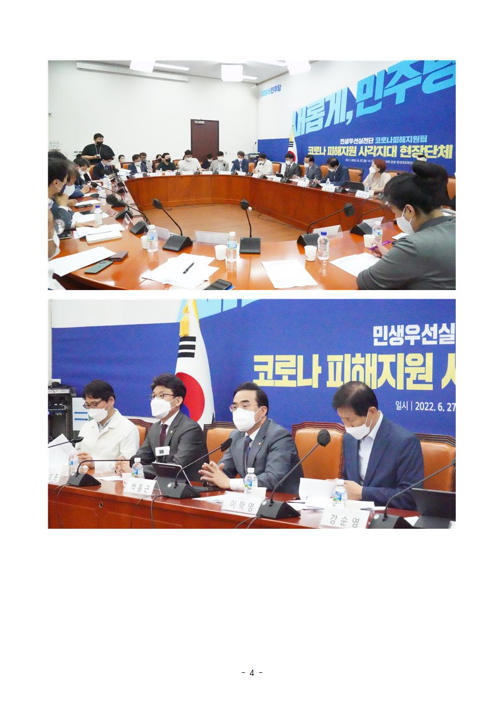 [보도자료] 더불어민주당 민생우선실천단, 코로나피해지원팀 "코로나 피해지원 사각지대 현장 단체 간담회" 진행