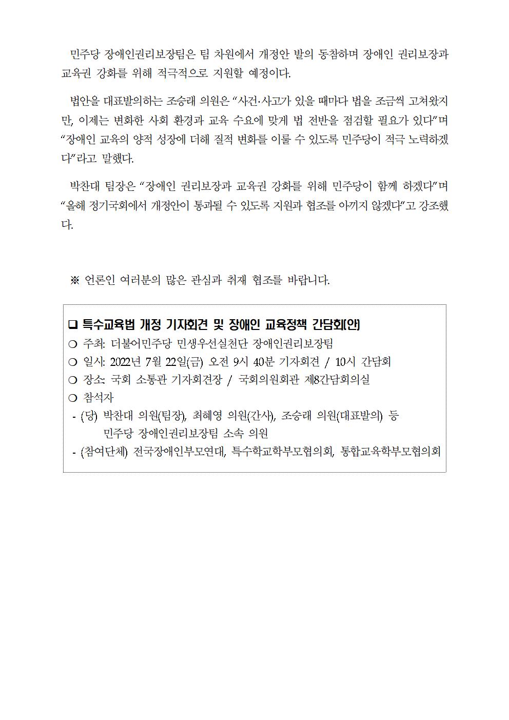 [보도자료] 더불어민주당 민생우선실천단 장애인권리보장팀, 장애인 교육권 실현을 위한 '특수교육법' 개정안 발의