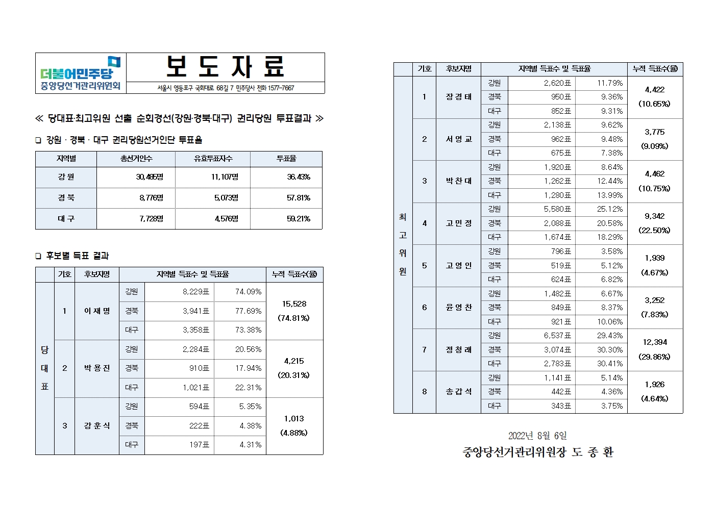 [보도자료]당대표‧최고위원 선출 순회경선(강원‧경북‧대구) 권리당원 투표결과