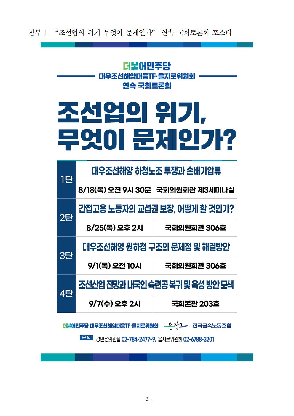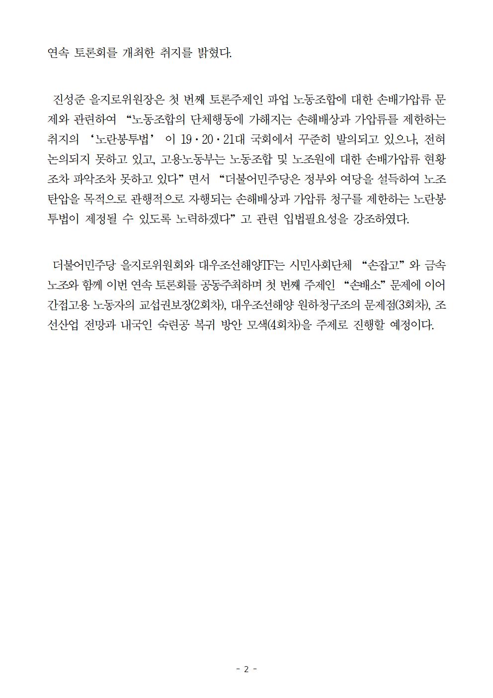 [보도자료] 더불어민주당 을지로위원회, 대우조선해양 하청노동자들이 제기한 조선업의 구조적 문제점과 그 해법을 모색하는 국회 연속토론회 “조선업의 위기, 무엇이 문제인가” 개최