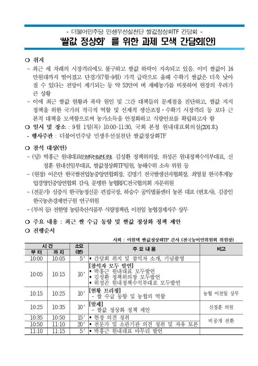 [보도자료] 더불어민주당 민생우선실천단, 농민 ‘살리고’ 식량안보 ‘지키는’ 더불어민주당 민생우선실천단 쌀값정상화TF 간담회 개최