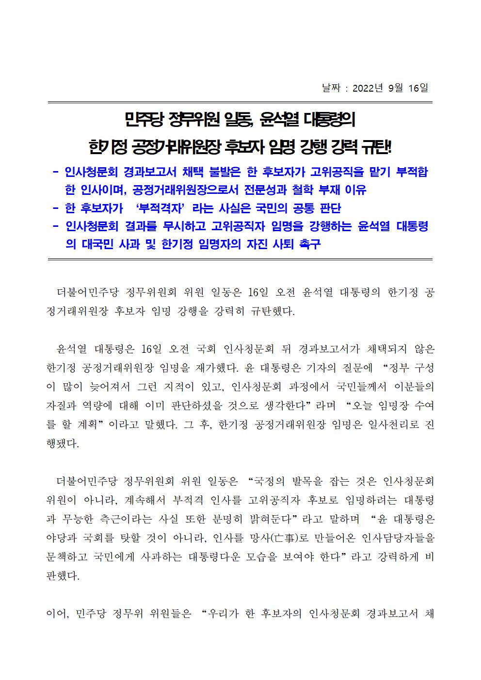 보도자료_민주당_정무위원_일동,_윤석열_대통령의_한기정_공정거래위원장_후보자_임명_강행_강력_규탄!(220916).hwp