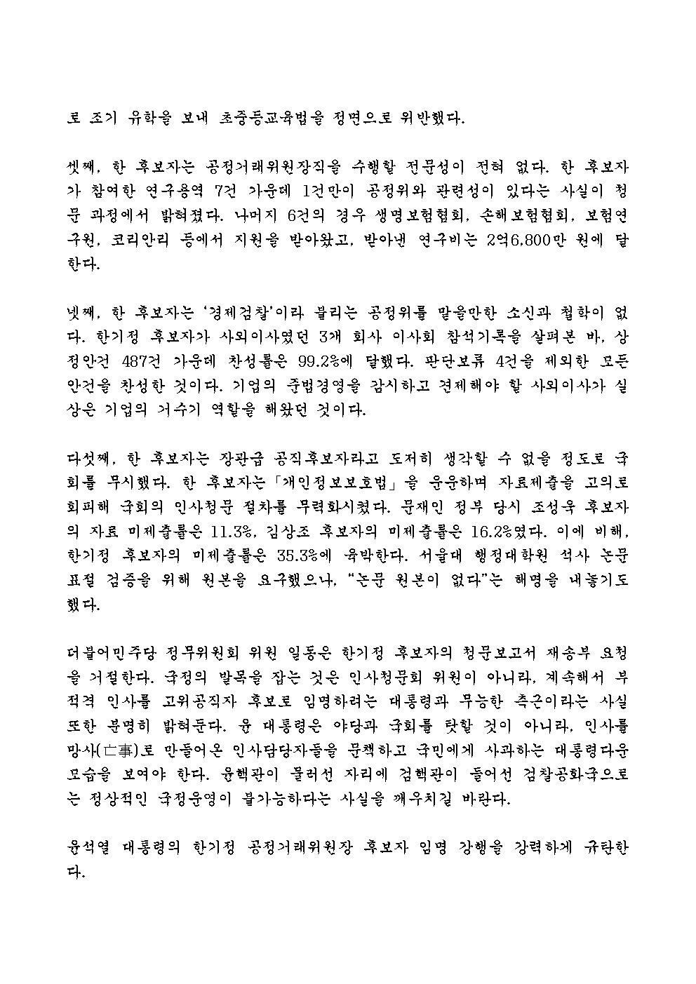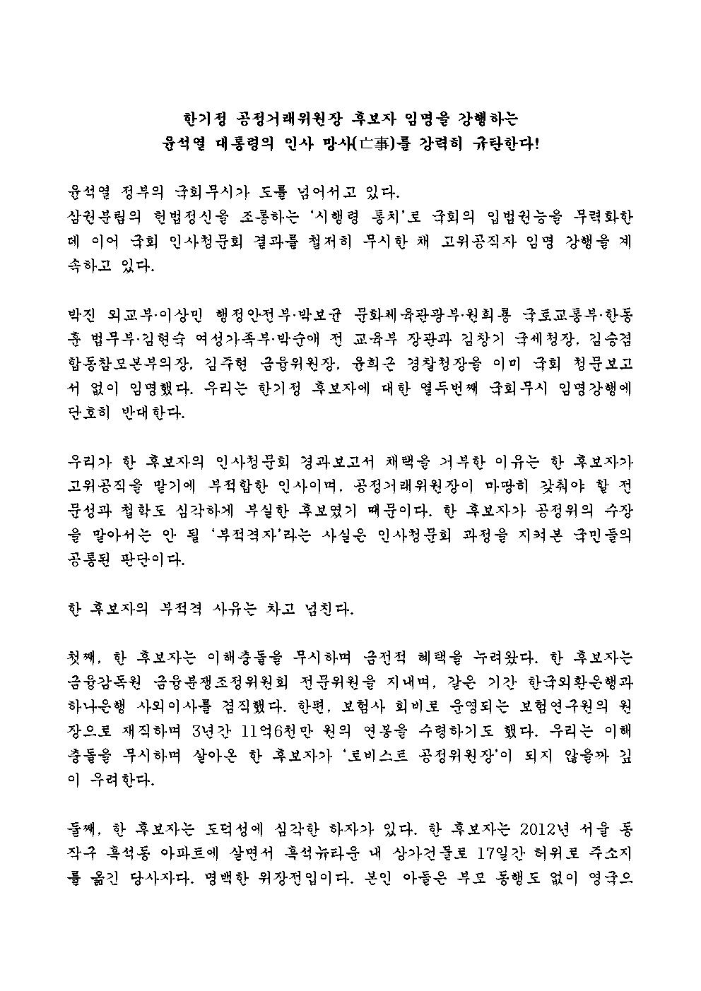 [보도자료 및 성명서] 민주당 정무위원 일동, 윤석열 대통령의 한기정 공정거래위원장 후보자 임명 강행 강력 규탄!