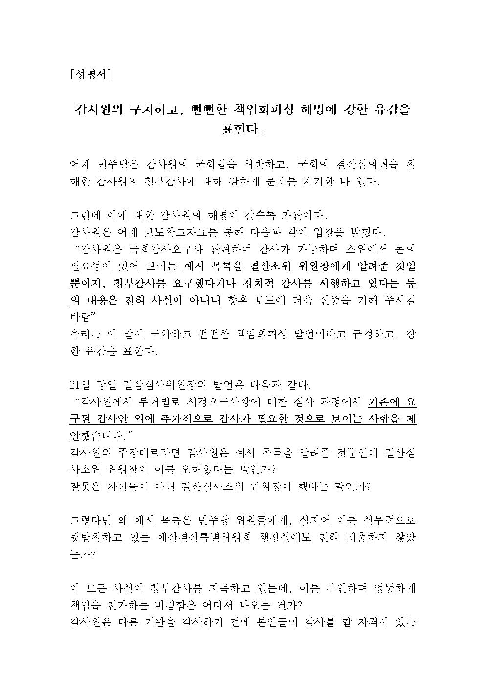 [성명서] 감사원의 구차하고, 뻔뻔한 책임회피성 해명에 강한 유감을 표한다.