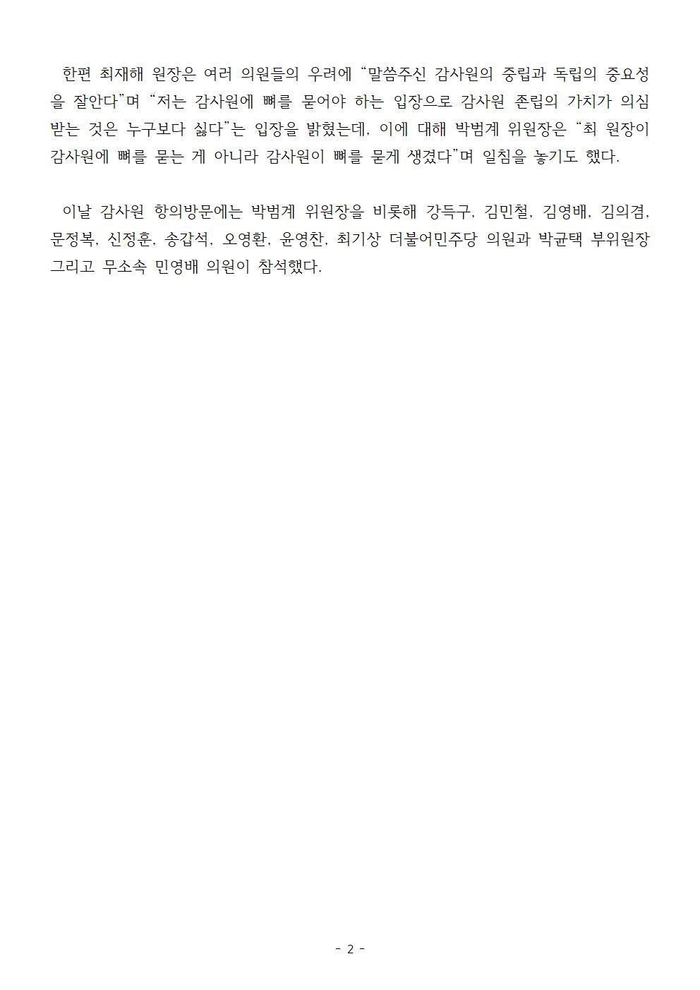 [보도자료] 민주당 정치탄압대책위 만난 최재해 감사원장 “두고봐라, 윤 정부에 대해서도 엄정히 감사할 것”