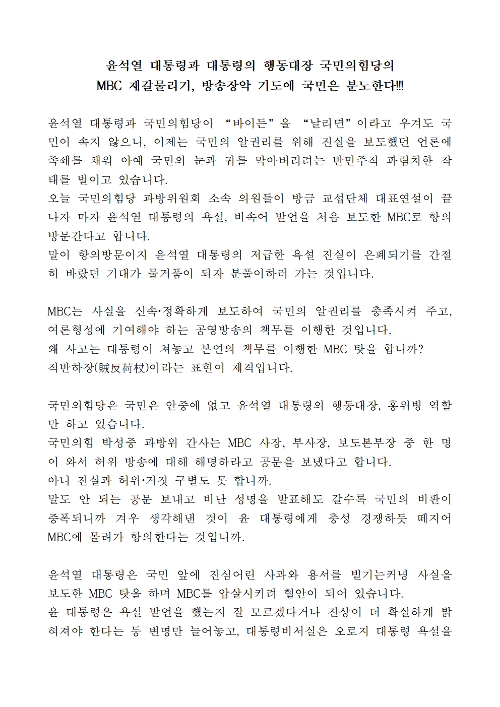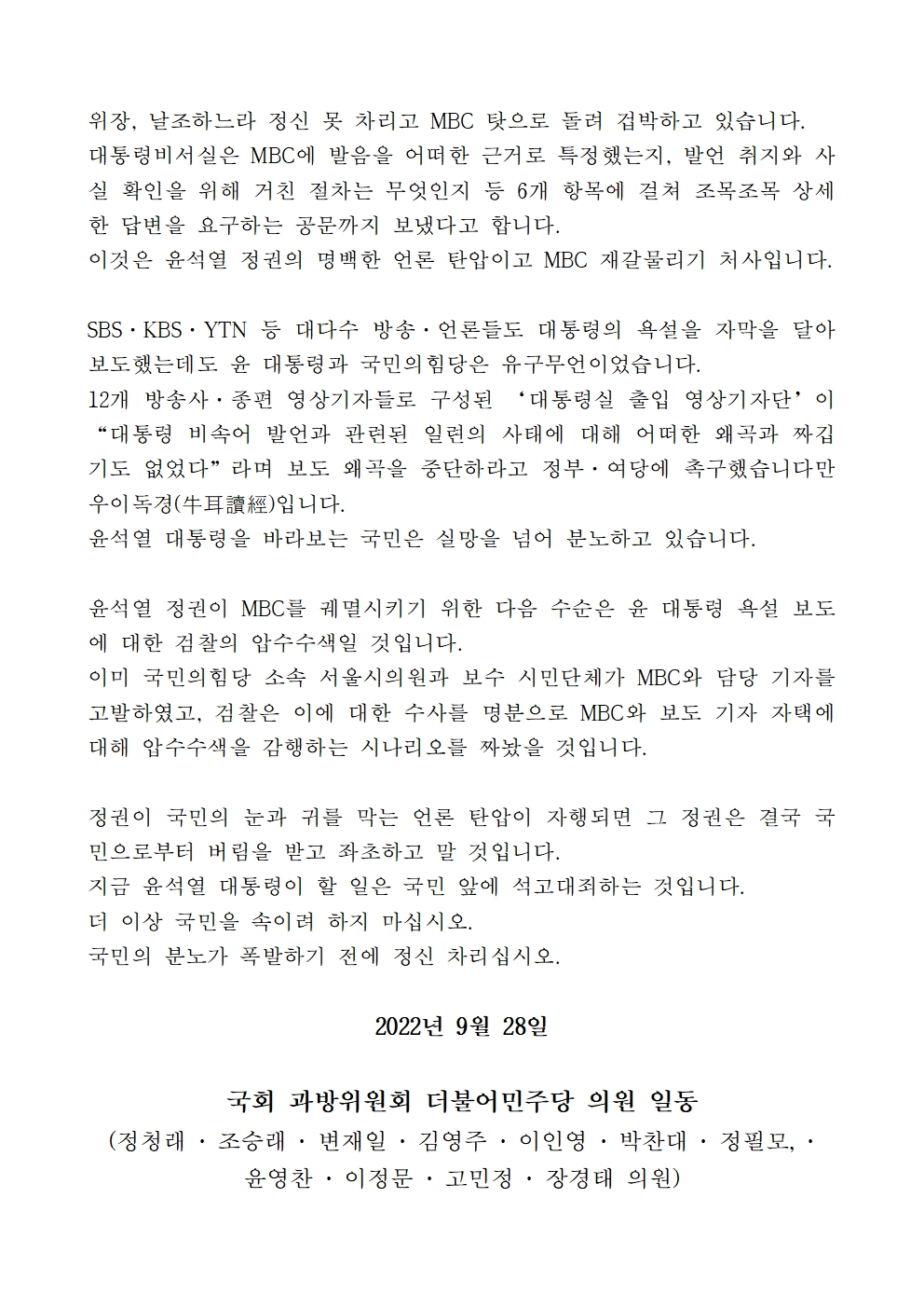 [기자회견문] 국회 과방위원회 더불어민주당 의원 일동, 윤석열 대통령과 국민의힘의 MBC 재갈물리기, 방송장악 기도에 국민은 분노한다