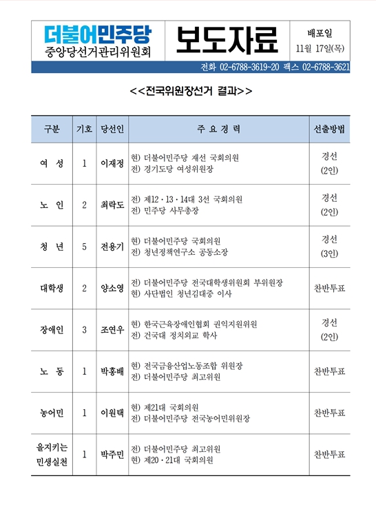 [보도자료] 중앙당선거관리위원회, 전국위원장 선거 결과