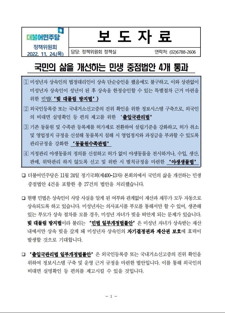 [보도자료] 더불어민주당 정책위원회, 국민의 삶을 개선하는 민생 중점법안 4개 통과