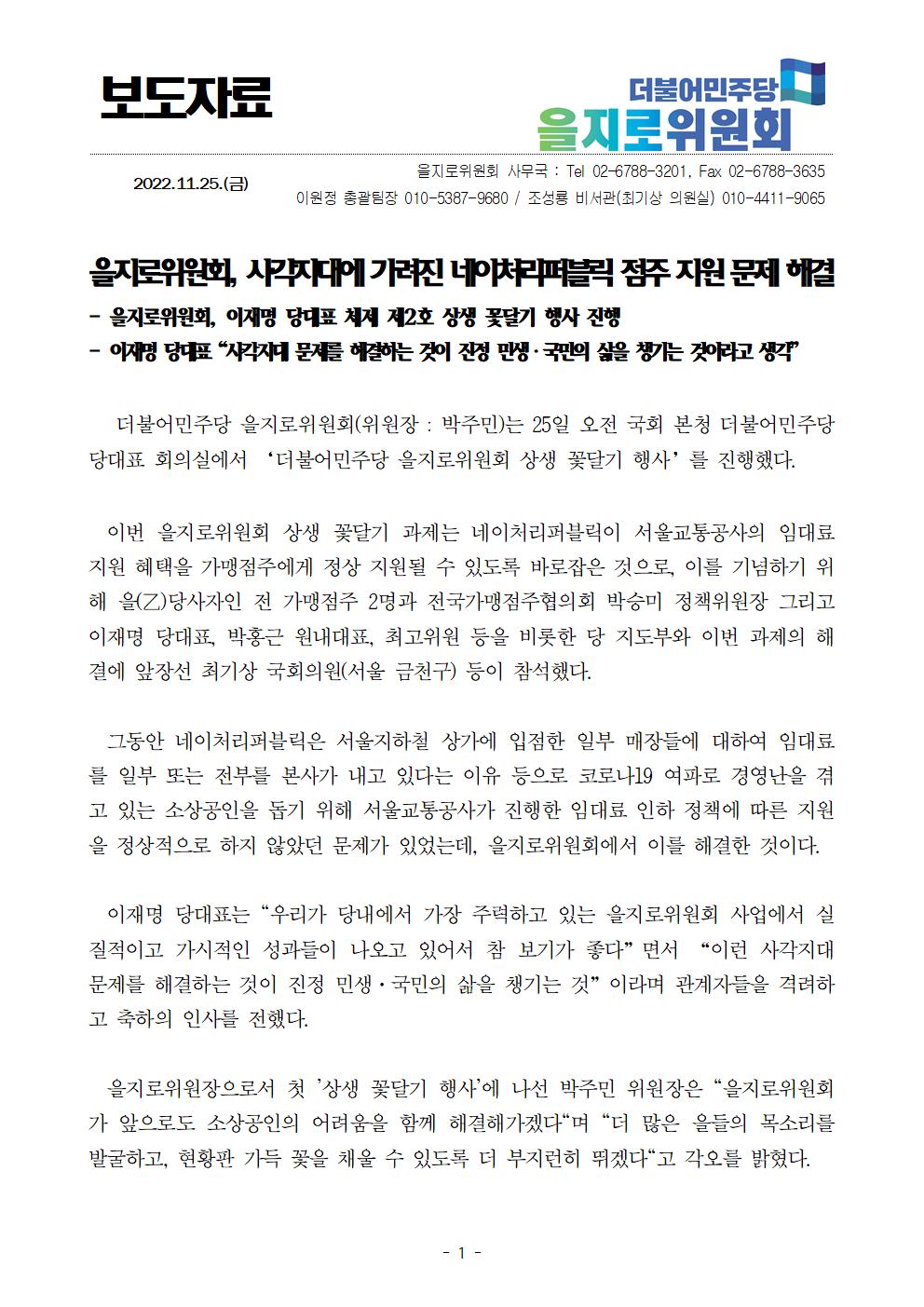 [보도자료] 더불어민주당 을지로위원회, 사각지대에 가려진 네이처리퍼블릭 점주 지원 문제 해결