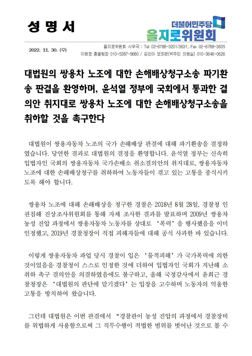 [성명서] 을지키는민생실천위원회, 대법원의 쌍용차 노조에 대한 손해배상청구소송 파기환송 판결을 환영하며, 쌍용차 노조에 대한 손해배상청구소송을 취하할 것을 촉구한다