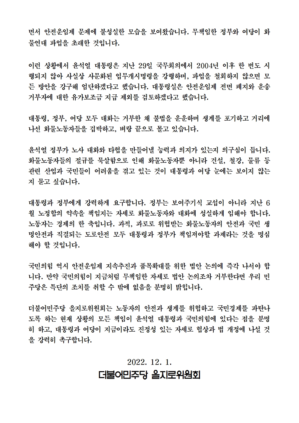 [기자회견문] 을지로위원회, 정부는 화물노동자 겁박과 독주를 멈추고, 국민의힘은 안전운임제 법안 논의에 즉각 나서라