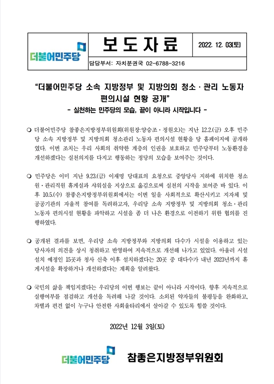 [보도자료] 더불어민주당 참좋은지방정부위원회, 더불어민주당 소속 지방정부 및 지방의회 청소·관리 노동자 편의시설 현황파악 공개