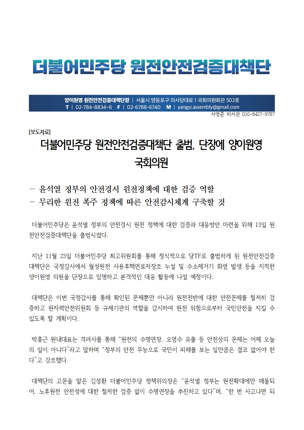 [보도자료] 더불어민주당 원전안전검증대책단 출범, 단장에 양이원영 국회의원