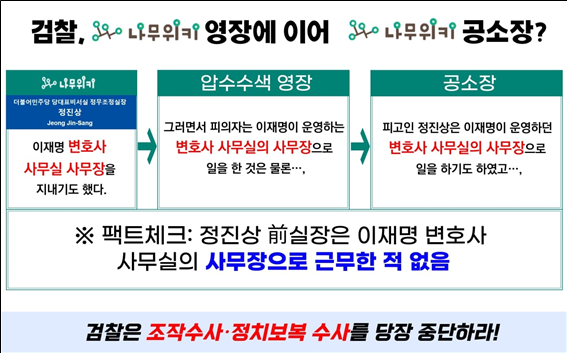 이는 지난 11월 검찰이 제시한 압수수색 영장에도 등장하는 허위 정보입니다. 정진상 실장은 이재명 변호사의 사무실에서 사무장으로 일한 적이 없습니다.