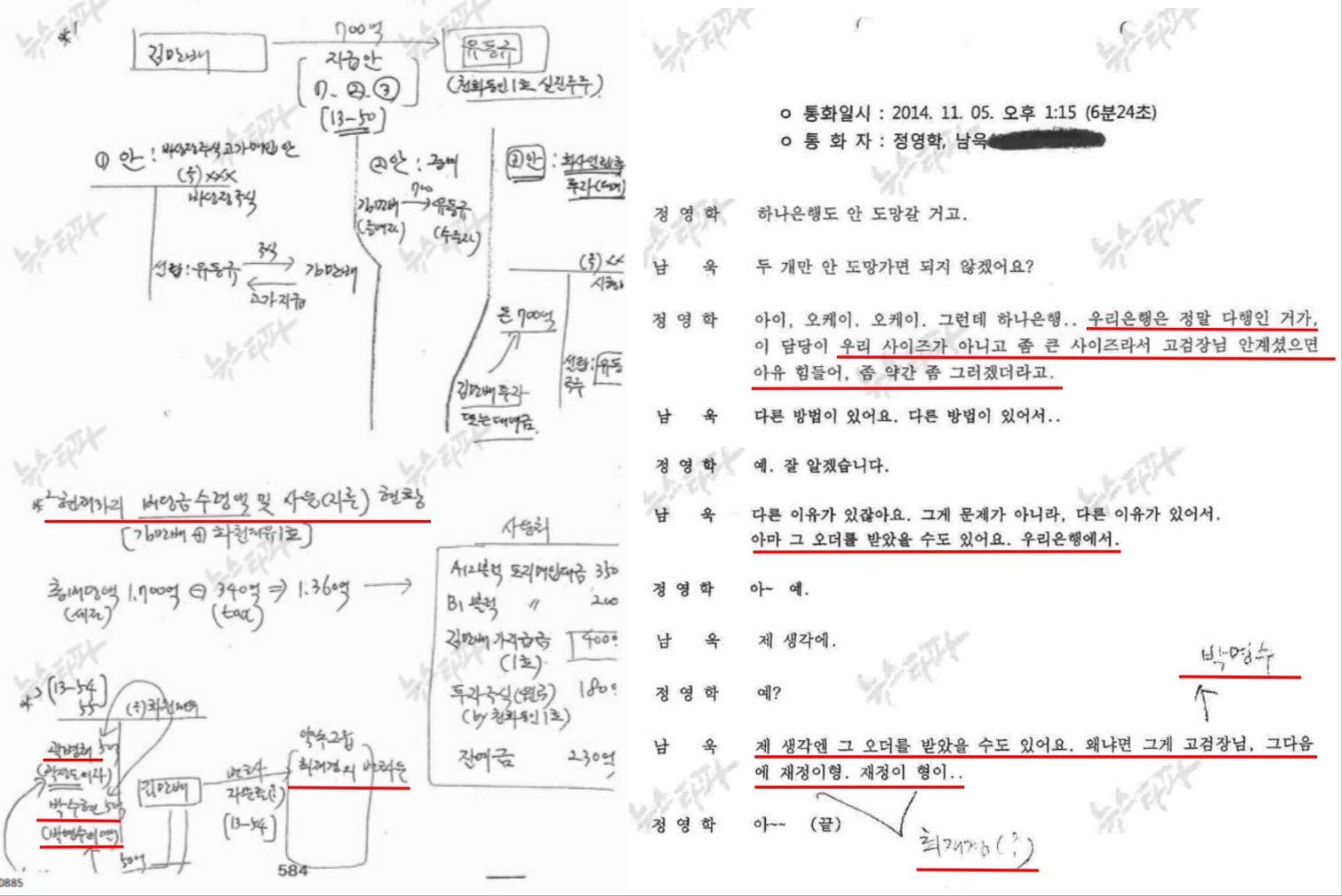 2014년 11월 5일 녹취록에서 정영학은 “하나은행..우리은행은 정말 다행인 거가, 이 담당이 우리 사이즈가 아니고 좀 더 큰 사이즈라서 고검장님 안 계셨으면 아유 힘들어”라고 말합니다. 같은 녹취록에서 남욱은 “아마 그 오더를 받았을 수 있어요, 우리은행에서” “제 생각에 오더를 받았을 수도 있어요. 왜냐면 그게 고검장님. 그 다음에 재정이형”이라고 언급합니다.