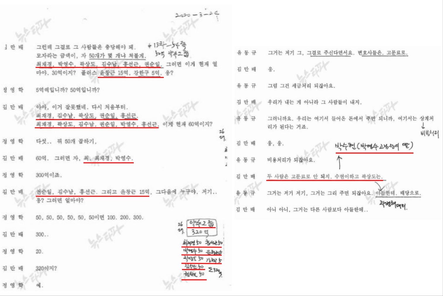 탐사보도전문채널 뉴스타파가 공개한 2020년 3월24일 정영학 녹취록에는 ‘약속그룹’의 일원으로 박영수 전 특검의 이름이 등장합니다. ‘50억’이라는 액수까지 이름 옆에 적혀 있습니다. 녹취록에는 김만배가 “50개가 몇 개냐 쳐볼게”라며 “최재경, 박영수, 곽상도, 김수남, 홍선근, 권순일”이라며 ‘50억 클럽’의 명단을 직접 읊는 장면도 나옵니다.