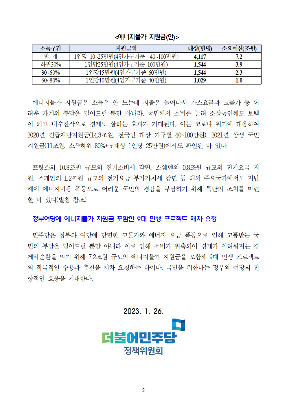 [보도자료] 더불어민주당 정책위원회, "민주당, '에너지물가 지원금' 마련 촉구!"