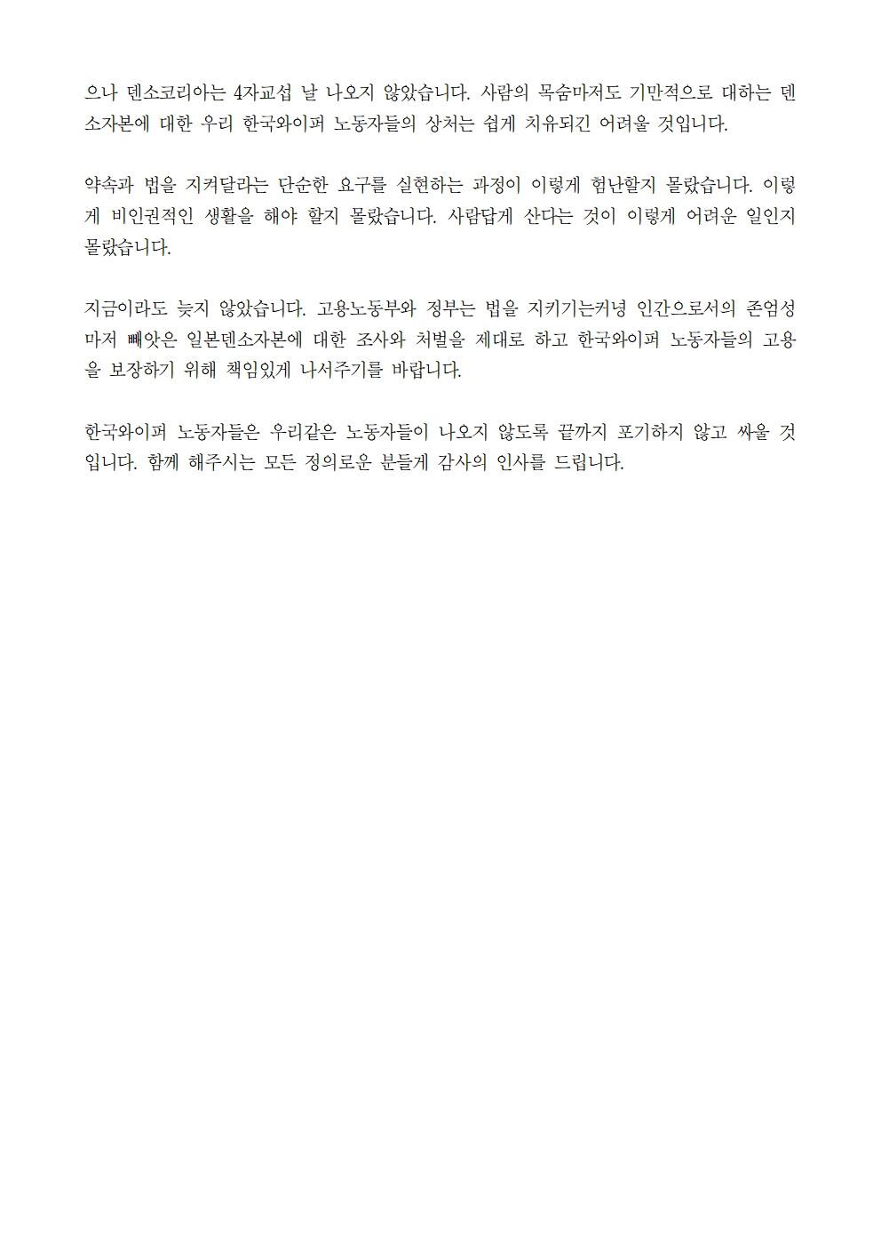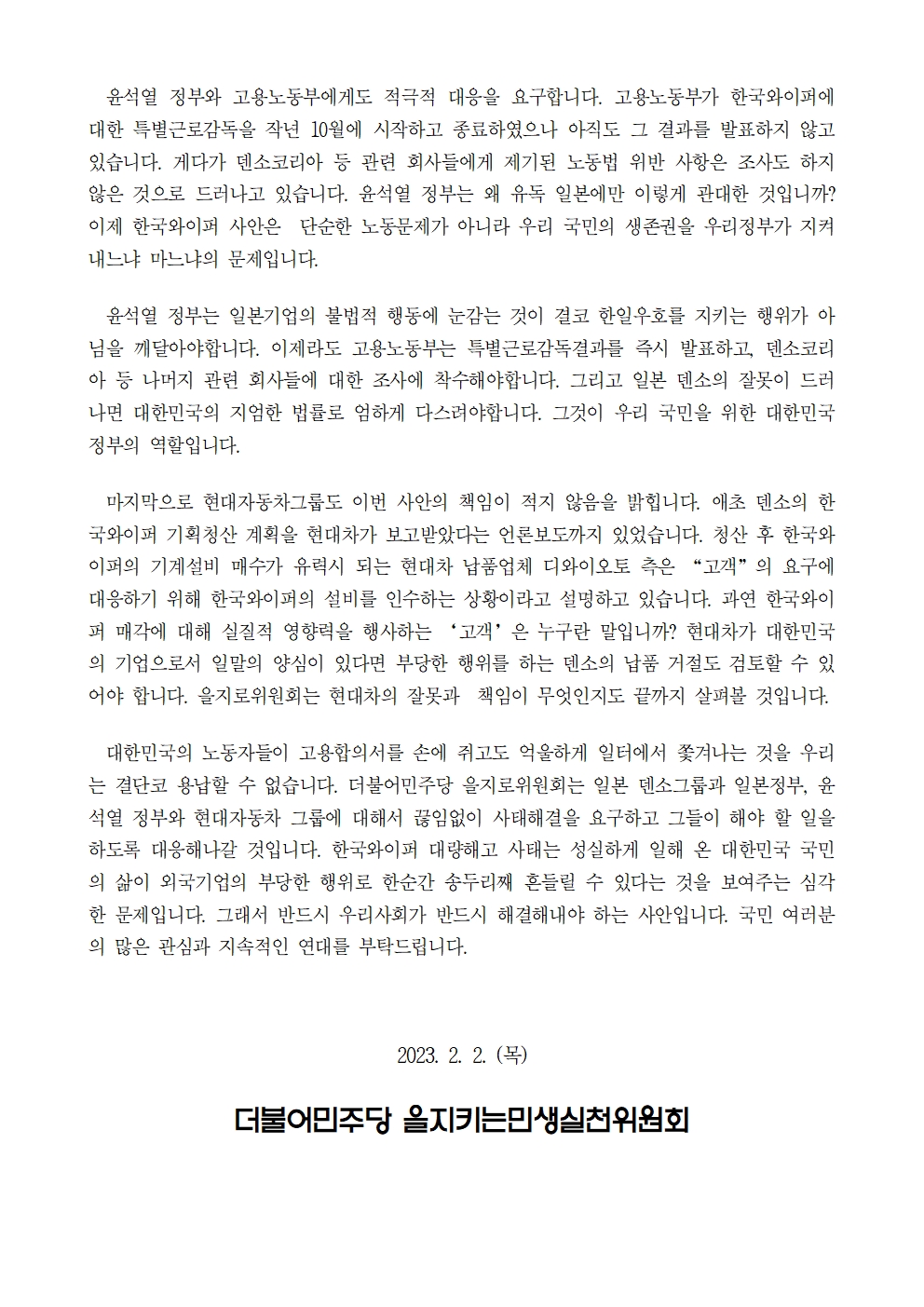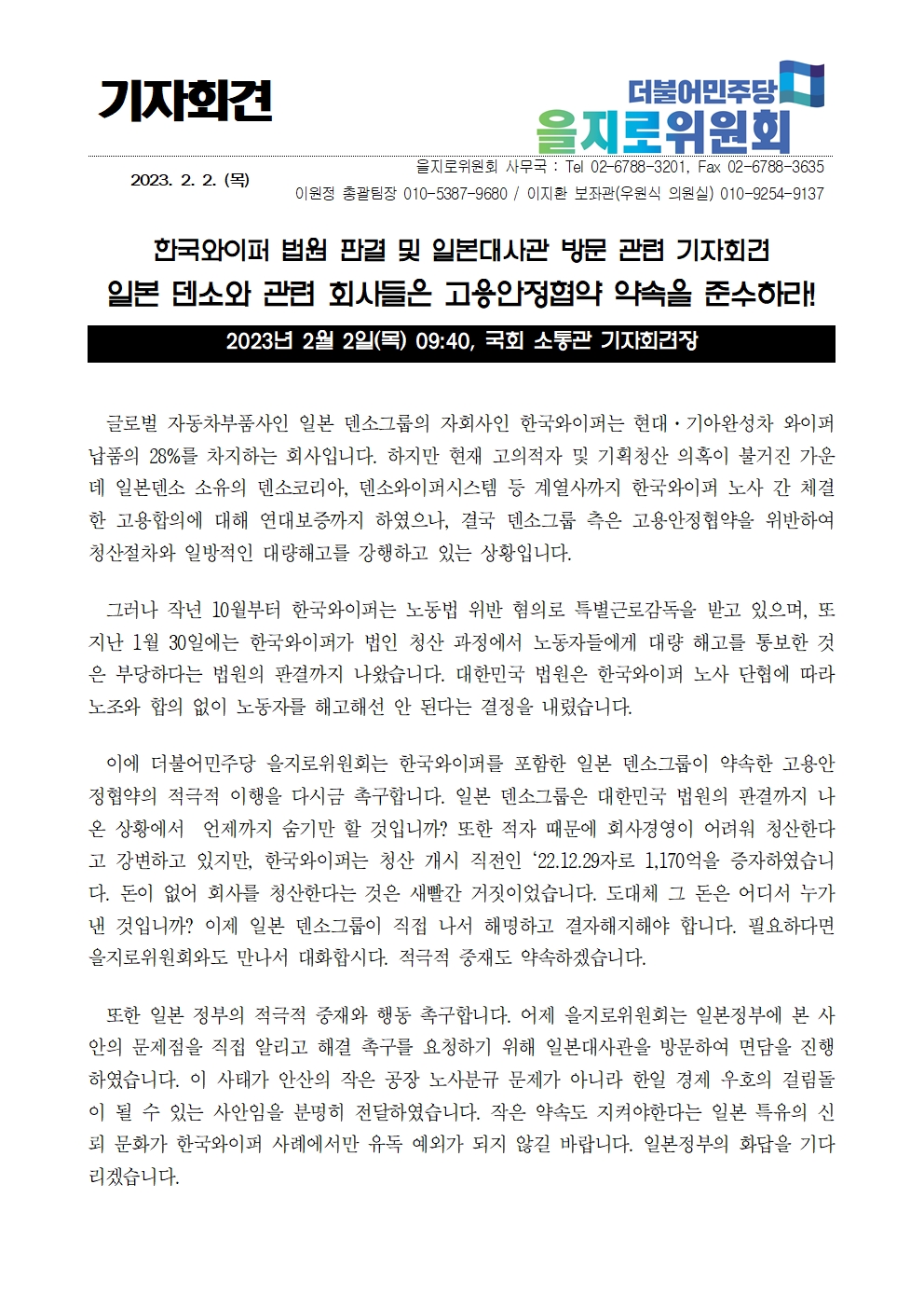 [기자회견문] 더불어민주당 을지로위원회, 일본 덴소와 관련 회사들은 고용안정협약 약속을 준수하라!