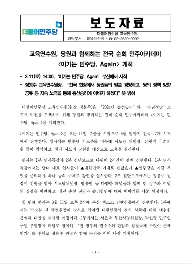 [보도자료] 더불어민주당 교육연수원, 당원과 함께하는 전국 순회 민주아카데미 '이기는 민주당, Again' 개최