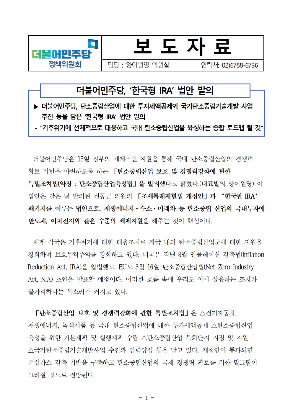[보도자료] 더불어민주당 정책위원회, 탄소중립산업에 대한 투자세액공제와 국가탄소중립기술개발 사업 추진 등을 담은 ‘한국형 IRA’ 법안 발의