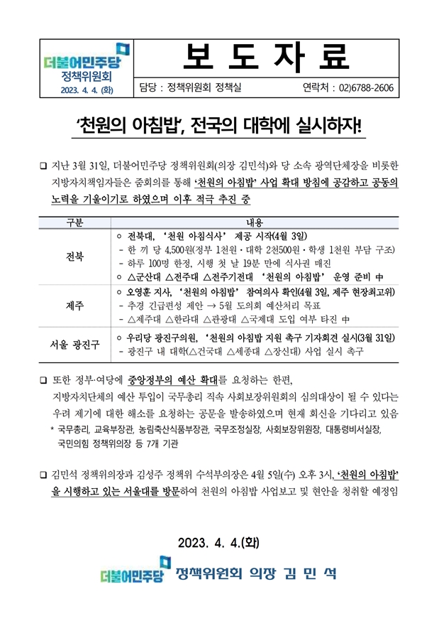 [보도자료] 더불어민주당 정책위원회, ‘천원의 아침밥’, 전국의 대학에 실시하자!