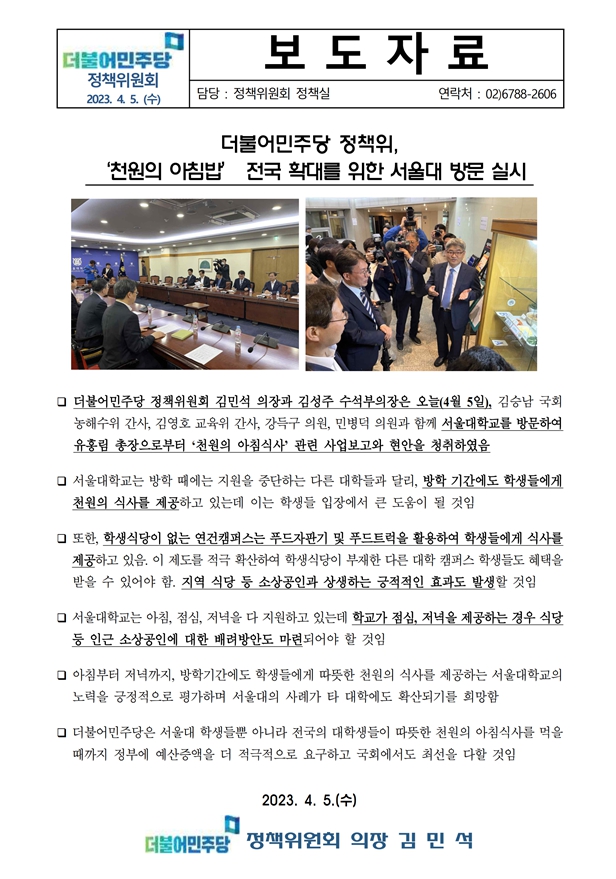 [보도자료] 더불어민주당 정책위원회, '천원의 아침밥' 전국 확대를 위한 서울대 방문 실시
