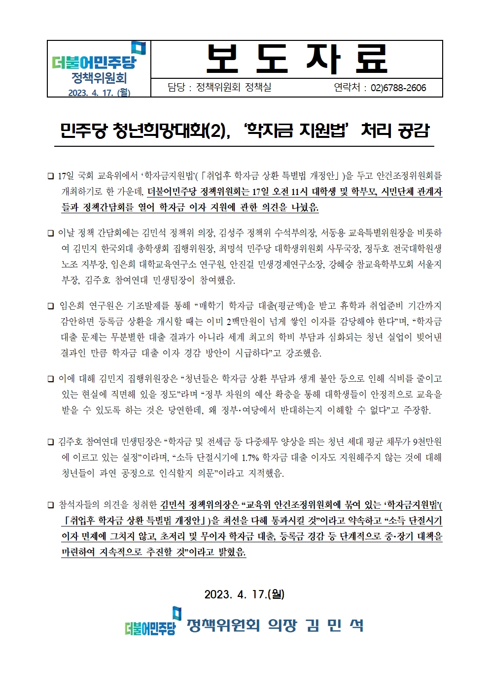 [보도자료] 더불어민주당 정책위원회, "민주당 청년희망대화(2), '학자금 지원법' 처리 공감"
