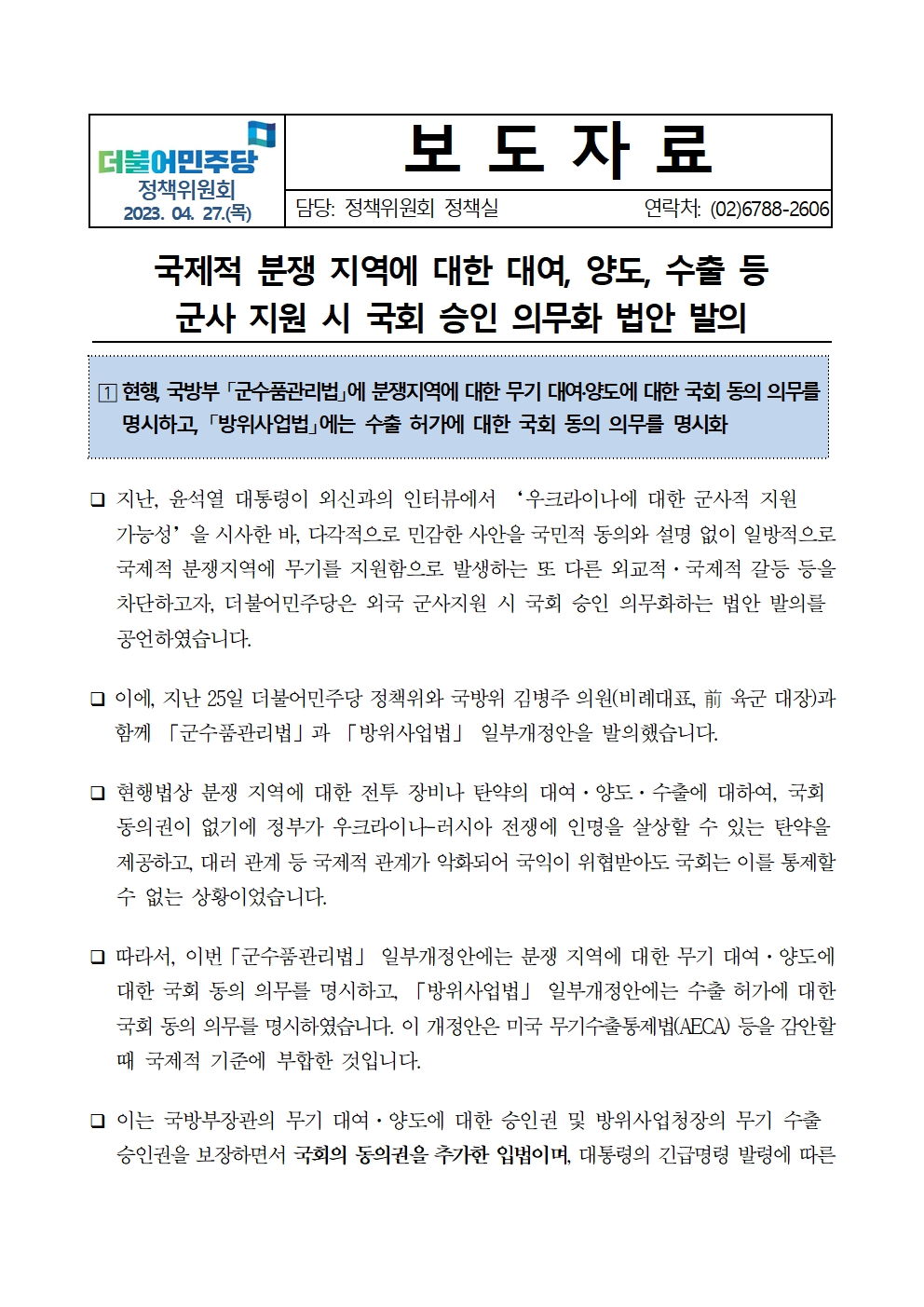 [보도자료] 더불어민주당 정책위원회, 국제적 분쟁 지역에 대한 대여, 양도, 수출 등 군사 지원 시 국회 승인 의무화 법안 발의