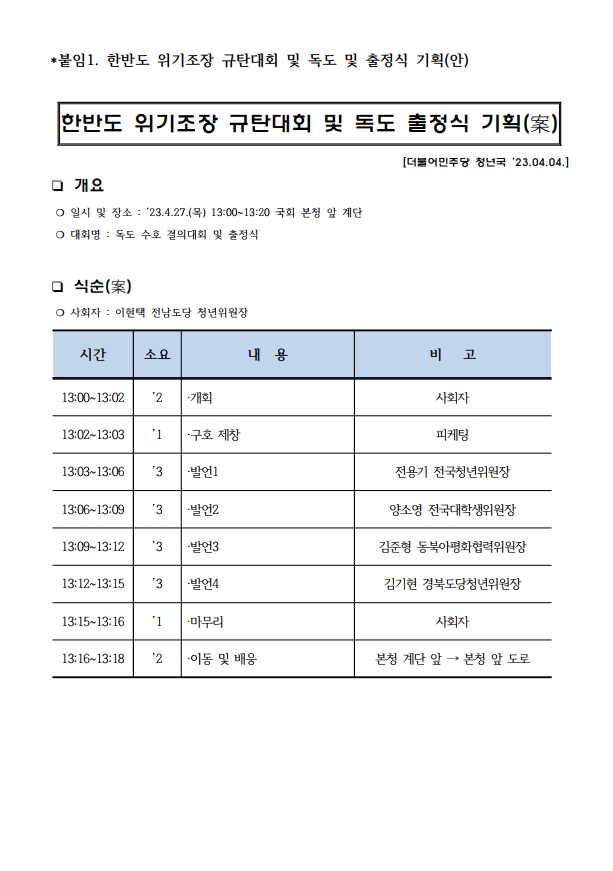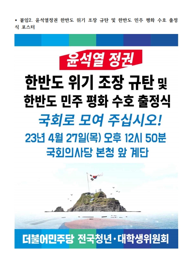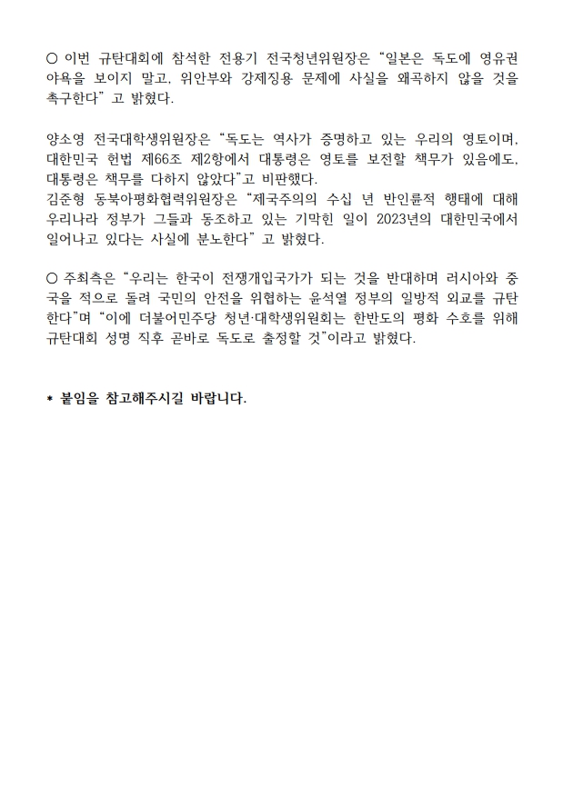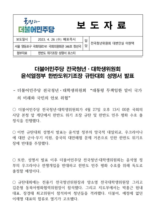 [보도자료] 더불어민주당 전국청년·대학생위원회, 윤석열정부 한반도위기조장 규탄대회 성명서 발표