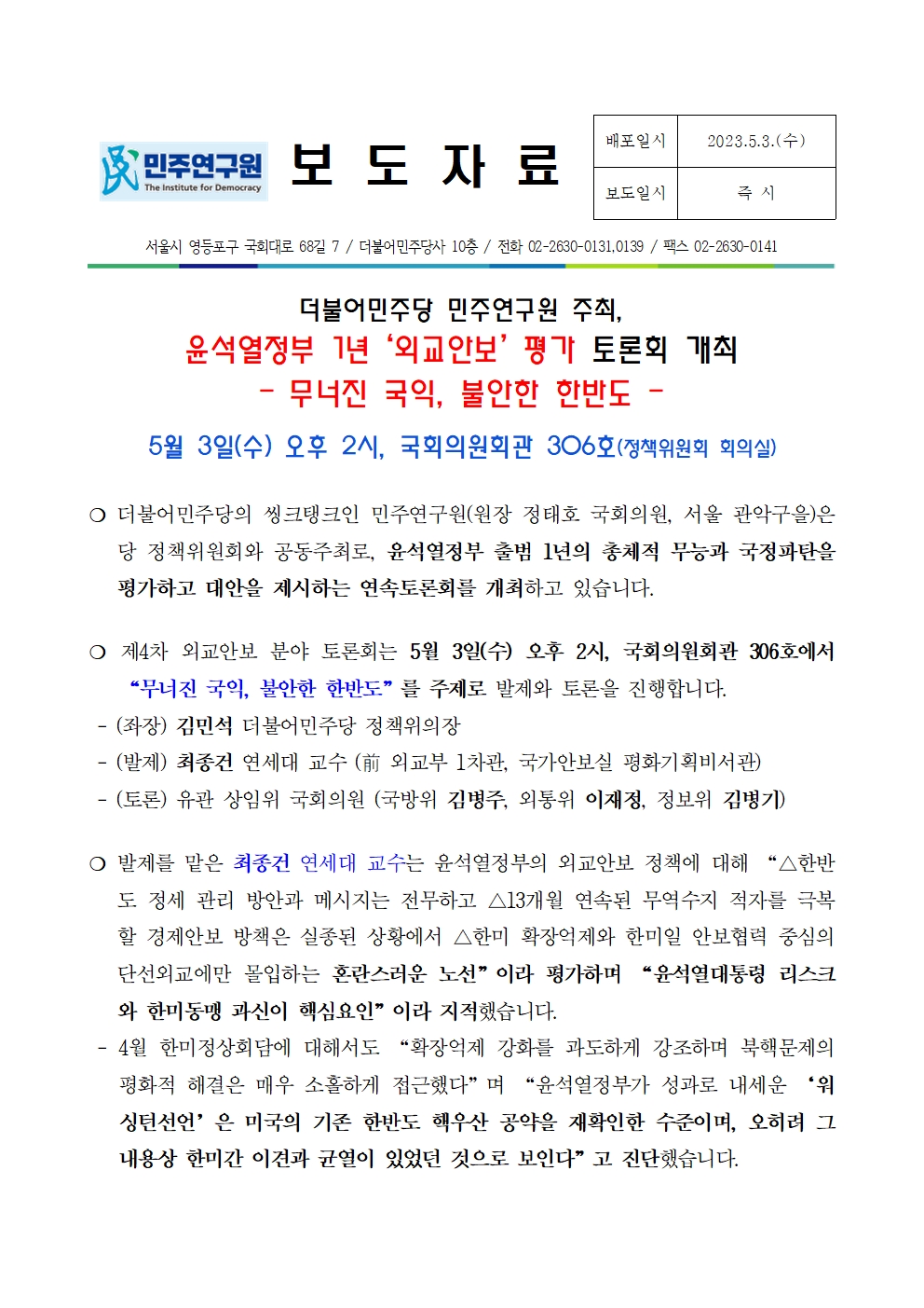 230503_보도자료_민주연구원,_윤석열정부_1년_평가_토론회_-_제4차_외교안보.pdf