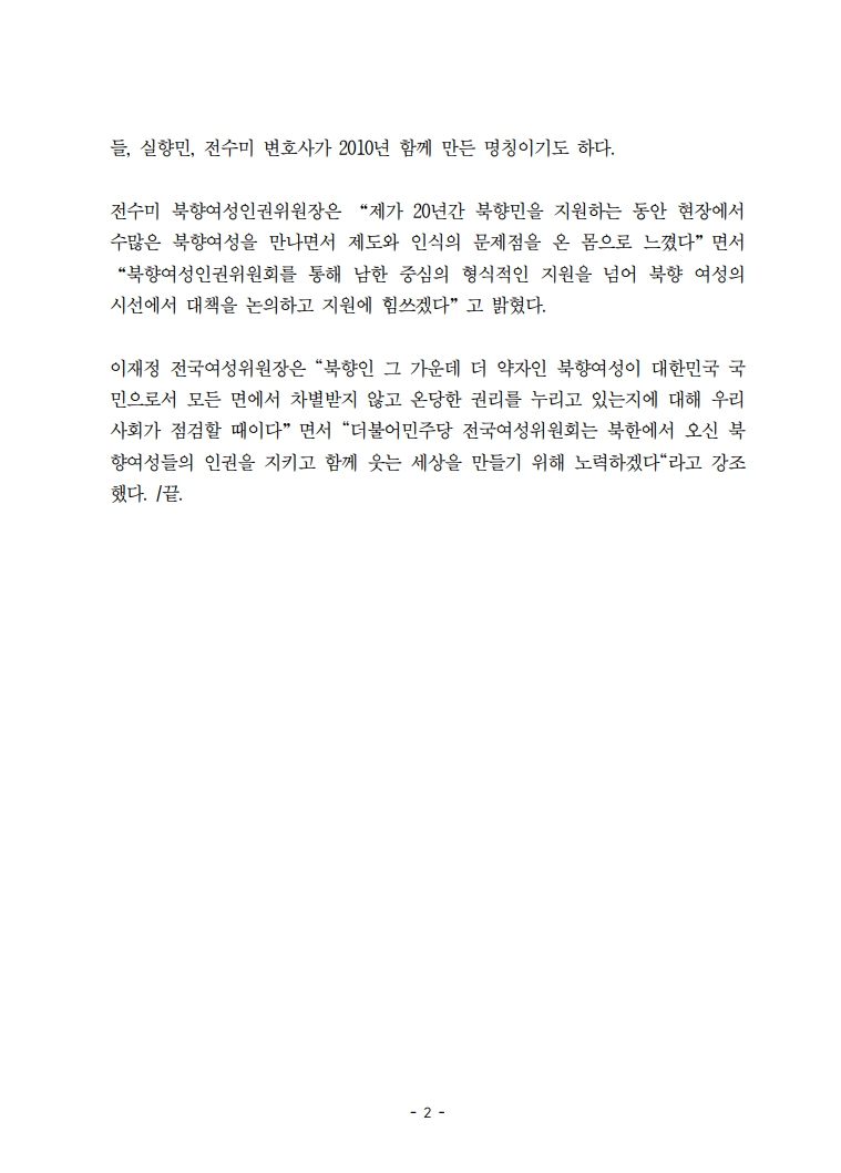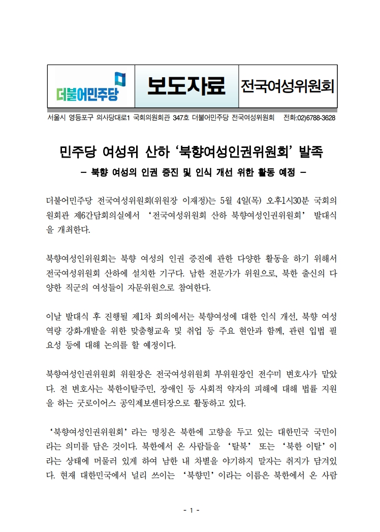 [보도자료] 더불어민주당 전국여성위원회, 여성위 산하 '북향여성인권위원회' 발족