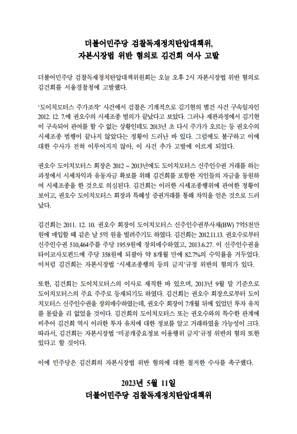 [보도자료] 더불어민주당 검찰독재정치탄압대책위원회, 자본시장법 위반 혐의로 김건희 여사 고발