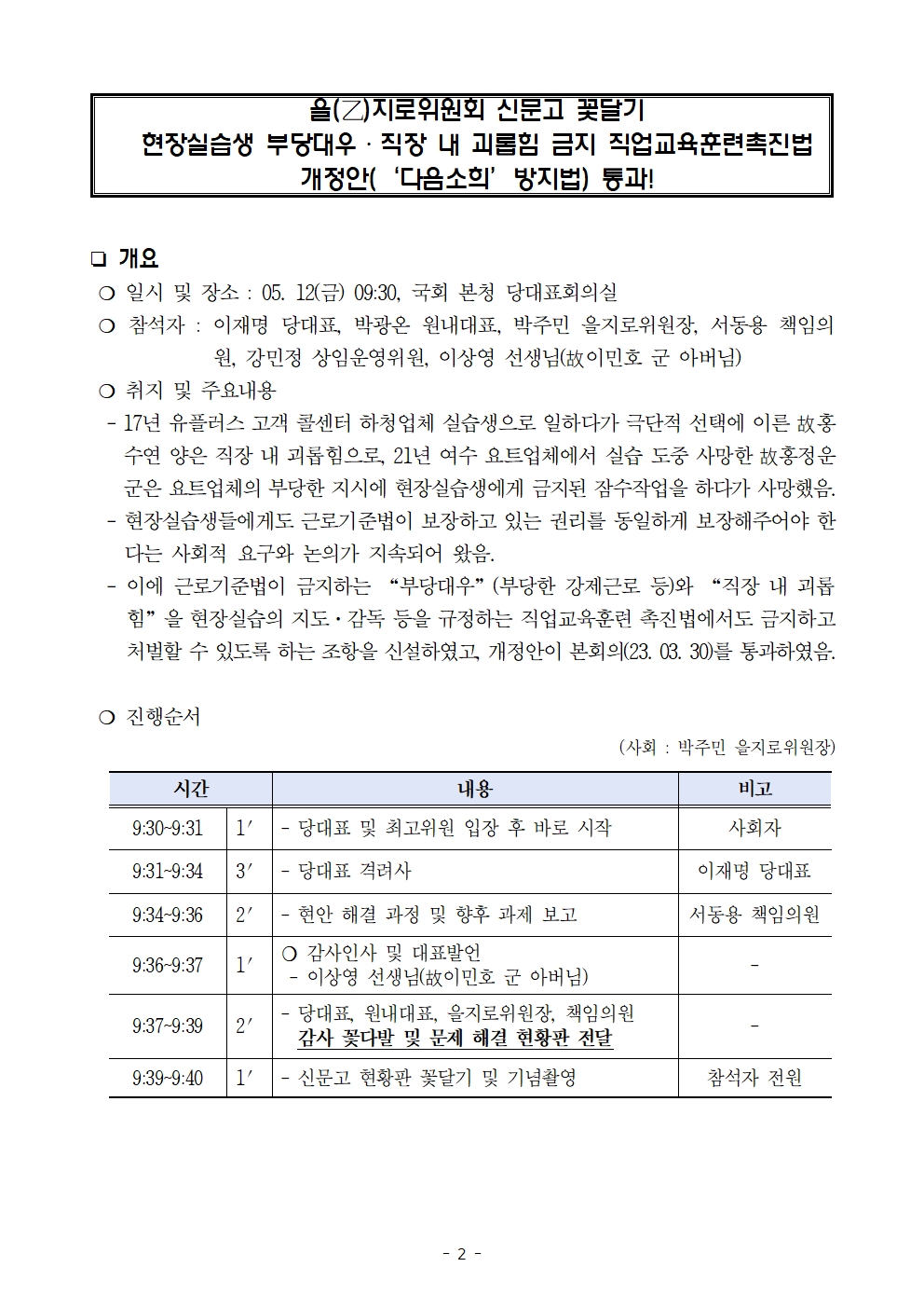 [보도자료] 더불어민주당 을지로위원회, '현장실습 권리 보호 다음소희 방지법 국회 통과, 상생 꽃달기 행사 열려'